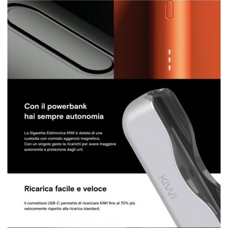 Kiwi Starter Kit è la valida alternativa per smettere di fumare. Mantiene il gusto pieno del tabacco, senza tabacco. Meno nociva, meno pericolosa. Con lo stesso piacere di sempre. Piccola e potente, Kiwi è stata progettata per essere la sigaretta elettronica più ergonomica e soddisfacente di sempre, dotata di un sistema di vaporizzazione che restituisce una resa aromatica unica ed avvolgente, La sua struttura, inoltre, contiene un alloggiamento ricaricabile di grande capienza per qualsiasi tipo di liquido. Semplice, intuitiva , reattiva. La superficie soft touch sostituisce pulsanti e fessure. garantendo maggiore igiene e consentendo un utilizzo più rapido ed essenziale. Il livello di carica, lo stato di accensione, tutto è visibile semplicemente sfiorando. La sigaretta elettronica Kiwi è dotata di una custodia con comodo aggancio magnetico. Con un singolo gesto la ricarichi per avere maggiore autonomia e protezione dagli urti. Il connettore USB-C permette di ricaricare Kiwi fino al 70% più velocemente rispetto alla ricarica standard. I filtri, realizzati in cotone di grado farmaceutico di alta qualità, non ti fanno rinunciare alle sensazioni tattili e alla piacevolezza del tiro da filtro a cui sei sempre stato abituato. Il canale d'aria è stretto e lungo, garantendo un sistema di anti-gocciolamento e anti-condensa. La cartuccia presenta un foro superiore per l'alloggiamento del filtro. Ha un serbatoio che può contenere 1.7ml di liquido ed ospita una resistenza in cotone da 1.2 ohm || Caratteristiche Dimensioni: 110 x 21 x 38 mm Batteria Starter Kit: 1650mAh + 400mAh Tempo di Ricarica: 1 ora e 30 minuti Capacità Cartuccia: 1.7 ml Voltaggio Aerosol: 10W ~ 13W Materiale dispositivo: ABS + Policarbonato || Assistenza e Garanzia Questo prodotto gode di due anni di garanzia. Cliccando sul seguente link: https://www.kiwivapor.com/ Registra il tuo prodotto tramite il seriale che trovi sul retro della confezione.